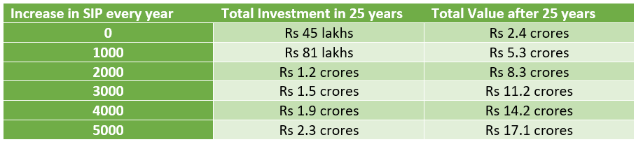 In the above example, even as you are increasing only Rs. 3000 in the monthly SIP amount every year (20% of Rs. 15,000), the corpus you end up accumulating after 25 years is more than 3 times the amount you would have earned without increasing anything.