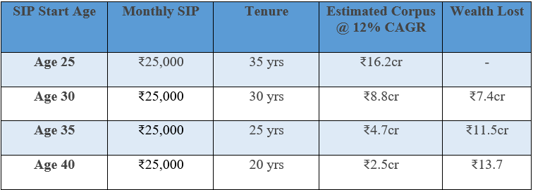 - Start 15 years later, and your wealth drops by ₹13.7 Crores