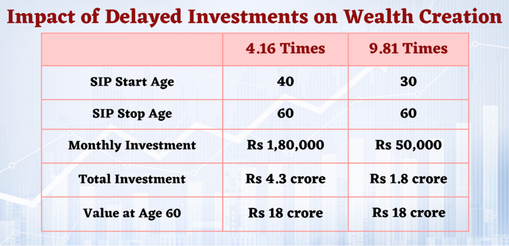 - Start 10 years later, and your wealth drops by ₹11.5 Crores