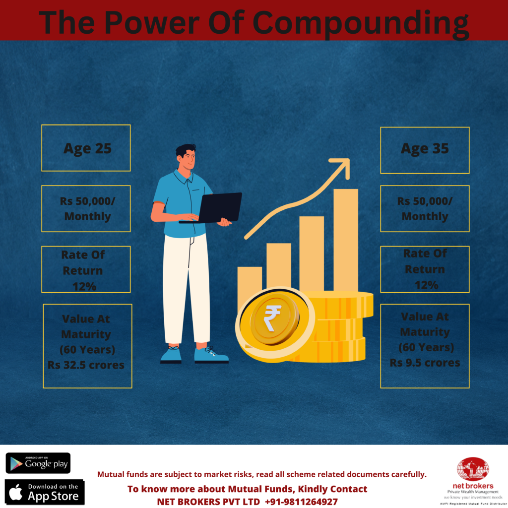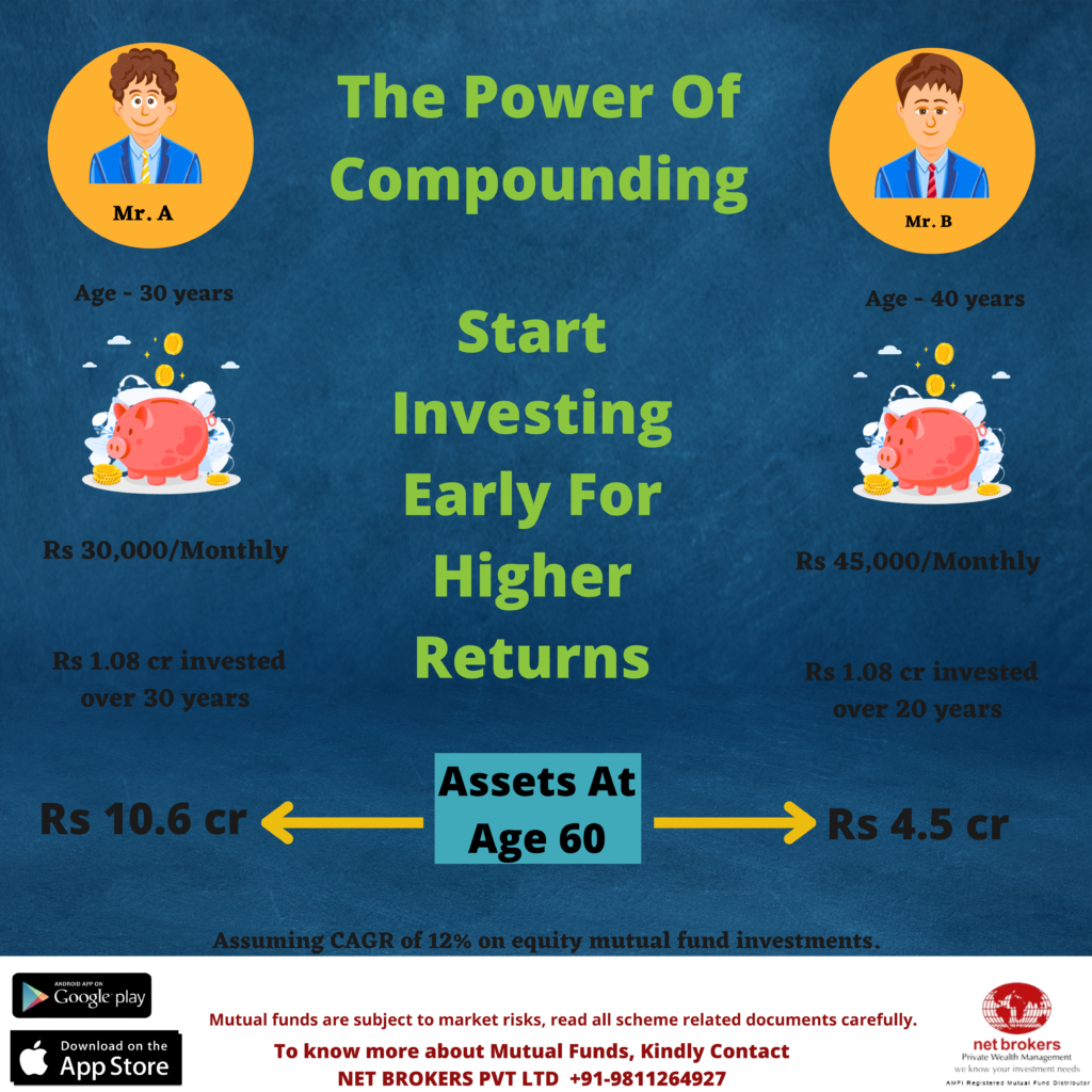 The power of compounding is directly proportional to your investment tenure. The longer you stay invested, the better returns you reap. Therefore, Net Brokers suggest its investors start early and stay invested for a long period of time to reap the benefits of compounding.
