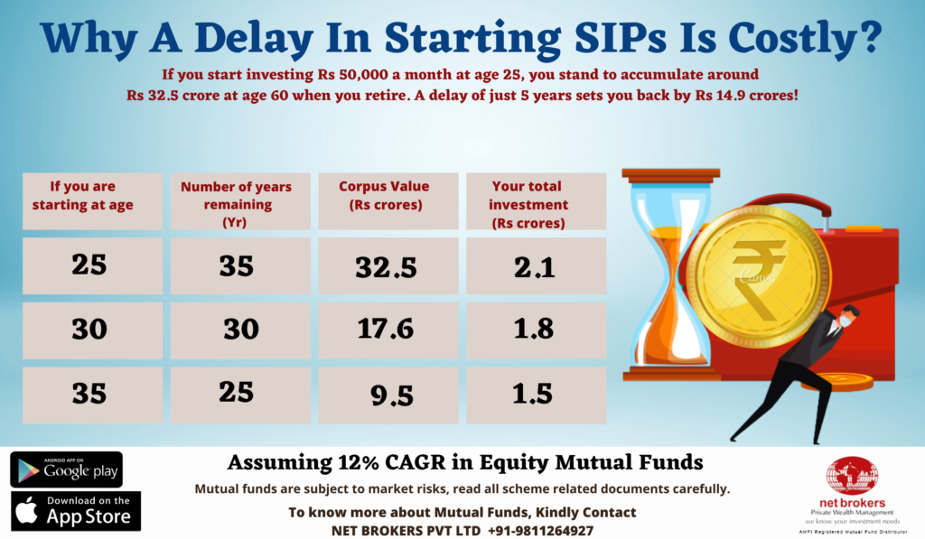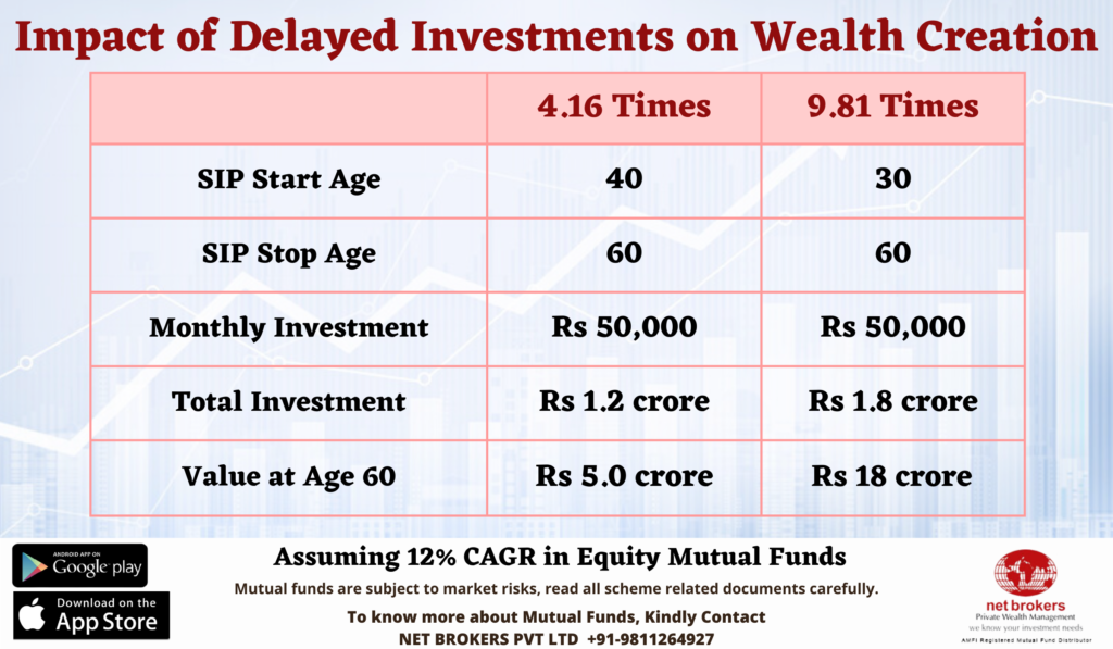 Considering the 12% CAGR returns, at the retirement age of 60 years, an investor who started his SIP of Rs 50,000 at the age of 30 years will be able to accumulate Rs 18 crores while another investor who started his SIP of the same amount 10 years later will only be able to accumulate Rs 5 crores.