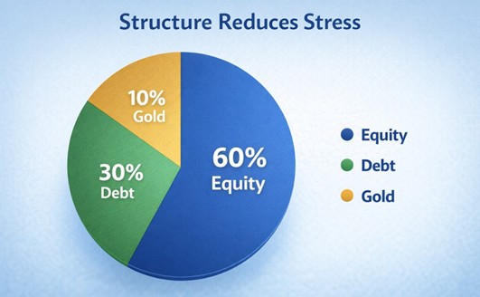 A balanced mix of equity (for growth), debt (for stability), and Gold or other assets (for diversification, if suitable) can help manage risk while aiming for reasonable growth.