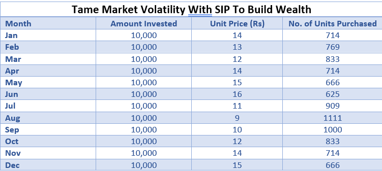 Thus, rupee cost averaging helps an investor beat market fluctuations and makes an investment averse to market volatility. By staying invested via SIPs in turbulent markets, investors can buy more units, and as markets turn favorable investors will receive fewer units. In the long run, SIPs can act as a shock absorber for your investment portfolio.