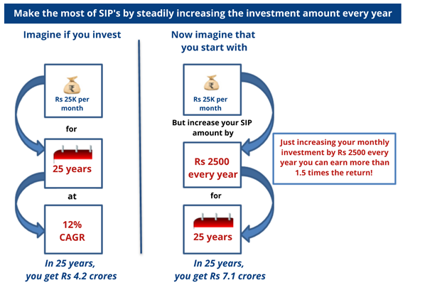 Thus, under the step-up SIP scheme, your SIP amount would increase by a specified amount every year, allowing you to step-up your investments over time. You can also specify a maximum SIP amount, which would serve as the maximum limit to which the SIP would increase over time. When the increased SIP reaches the maximum specified amount, no more increase would be affected, and your investments would continue at the maximum amount.