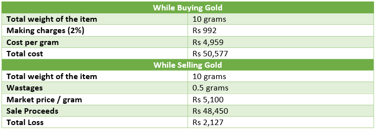 You think you made a profit of Rs 423. But wait, the jeweller pays you only Rs 48,450. Notice that the price of gold has gone up. But you still made a loss of Rs 2,127. This is because the jeweller will remove making charges and wastages from the sales price.