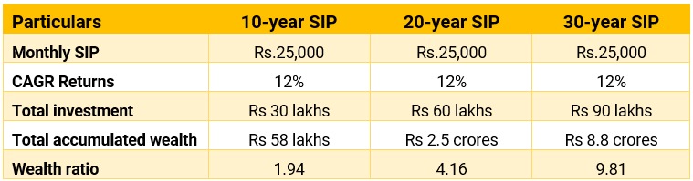 When you invest regularly through SIPs, your returns get reinvested. Over time, this result in a snowball-effect, that may increase your potential returns manifold. An ideal way to maximise this gain is to invest for an extended period. This also means you may benefit by investing as early as possible.